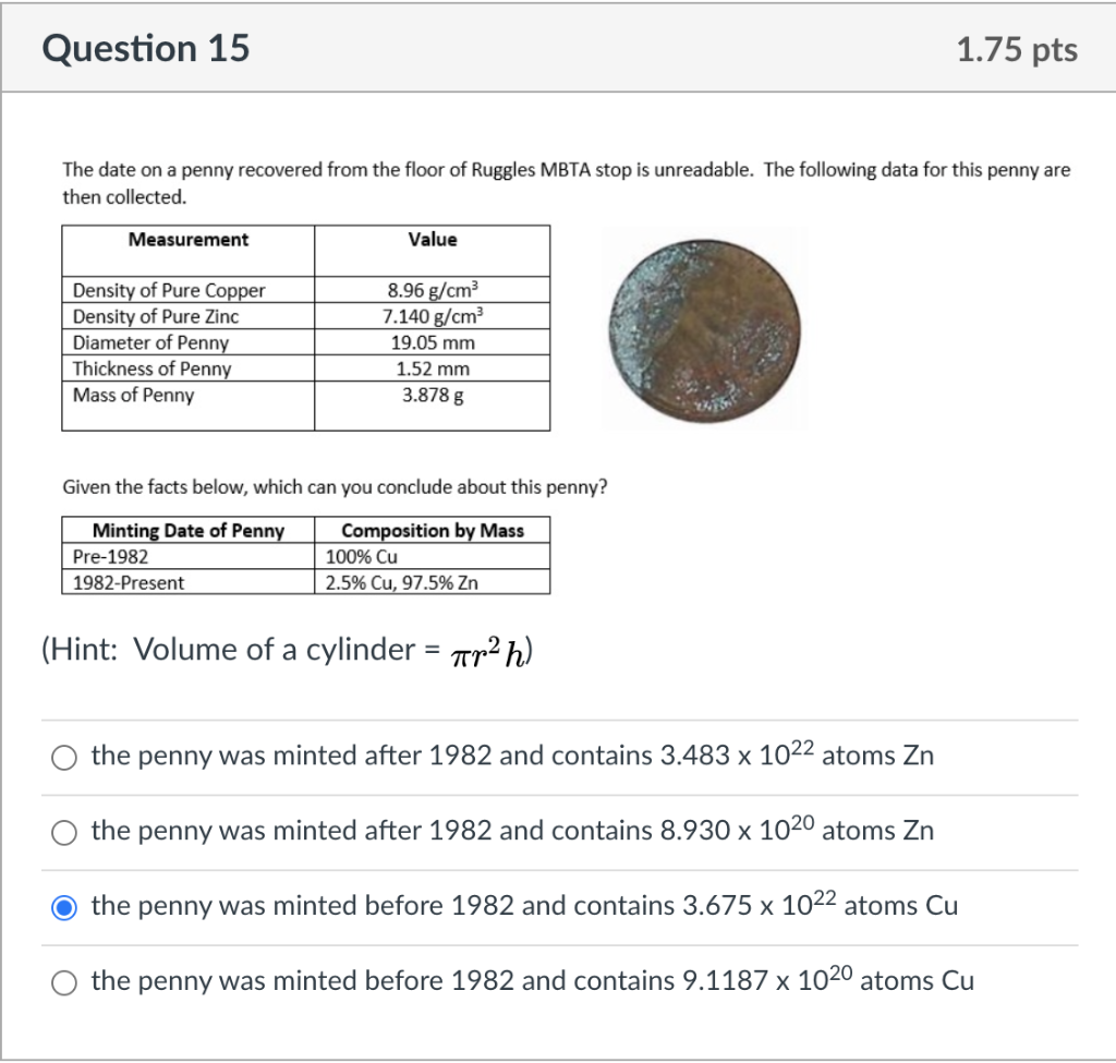 The penny was measured using Vernier calipers. OlumeofCu 196 cm Cu 96 mm CuV. The penny was cut and placed in excess hydrochloric acid.